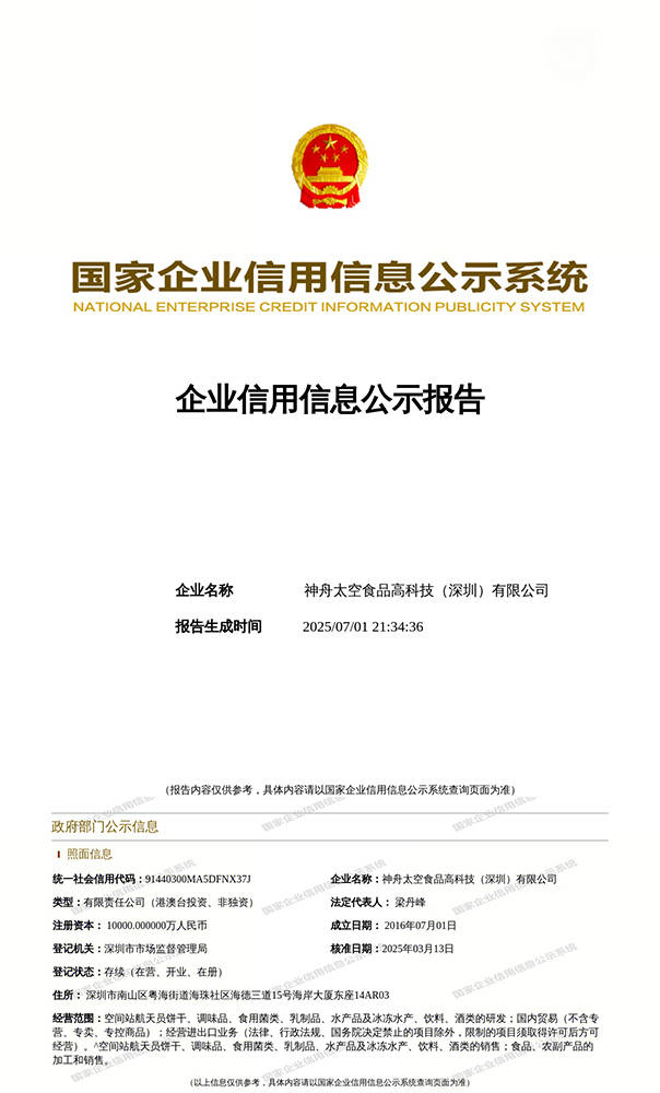 颠末正在国度专利局网坐的查证,神舟太空食物高科技(深圳)无限公司独家具有由中国航天员科研锻炼核心授权的空间坐航天员食物专利手艺——《空间坐航天员高能压缩食物及其制法》,为糊口添加一份保障。能量持久,为储存和利用供给了极大便当。